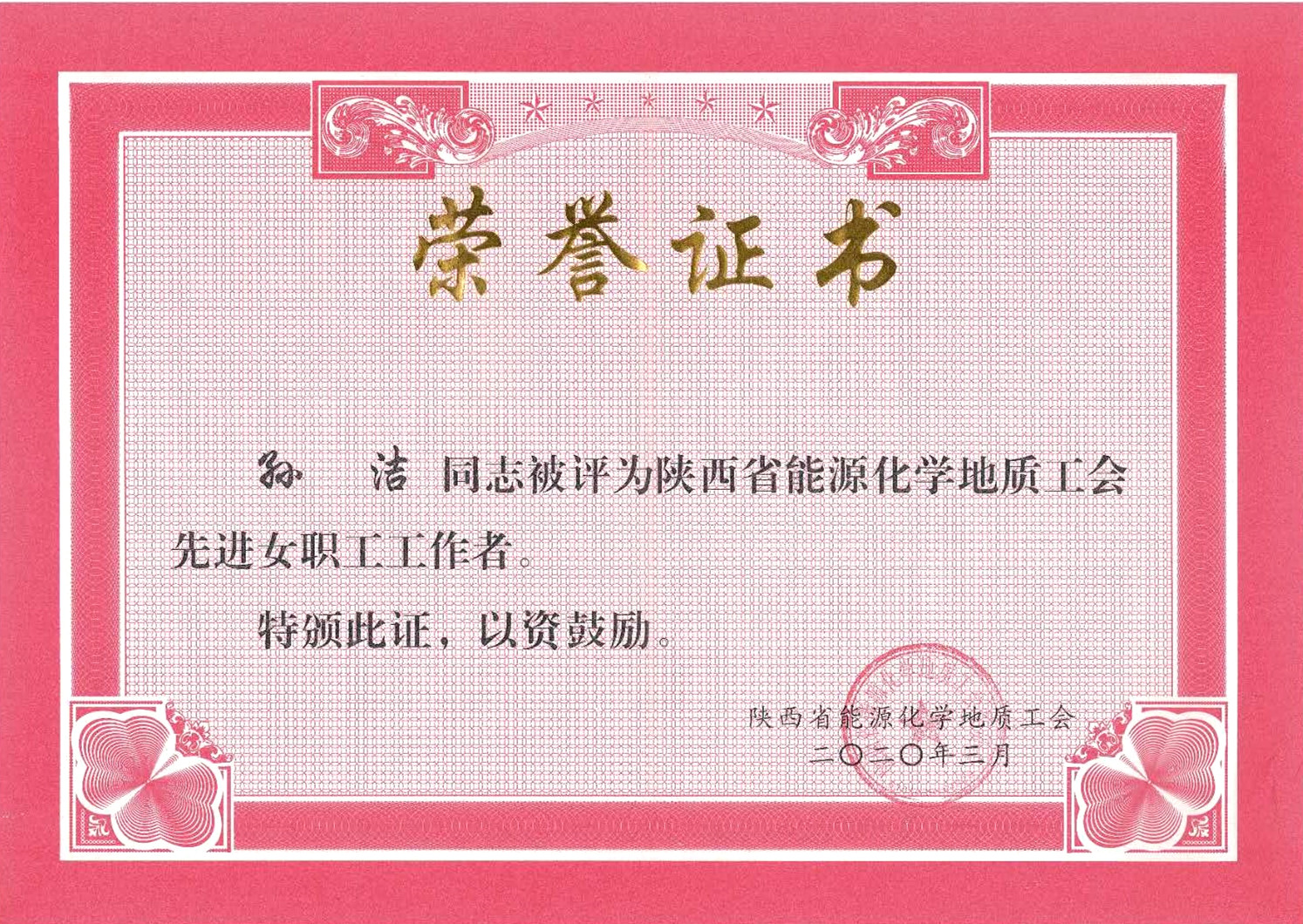 ? ? 省能源化學地質工會評選表彰了2017-2019年在女職工建功立業和女職工素質提升工程中做出突出貢獻的集體和個人,及在工會女職工工作中成績突出的工會女職工組織和女職工工作者。我公司女工主任孫潔同志榮獲“陜西省能源化學地質工會先進女職工工作者”?榮譽稱號。