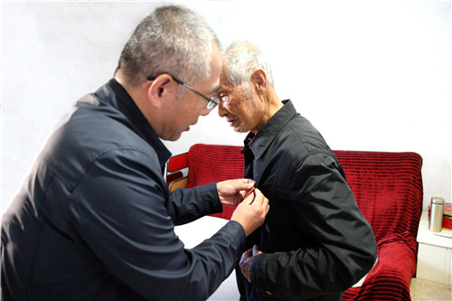 ? ? 許俊賢同志祖籍陜西涇陽,抗美援朝后轉業到地方工作,1975年調到物化探隊工作。23日上午,李新勝來到老戰士許俊賢家中,鄭重地為年近九旬的老人佩戴紀念章,并親切交談,關切詢問他的生活起居、健康狀況等情況,代表物化探隊黨委向許俊賢老人表示親切慰問,對許俊賢老戰士為保衛祖國、捍衛和平作出的奉獻與犧牲致以崇高敬意。