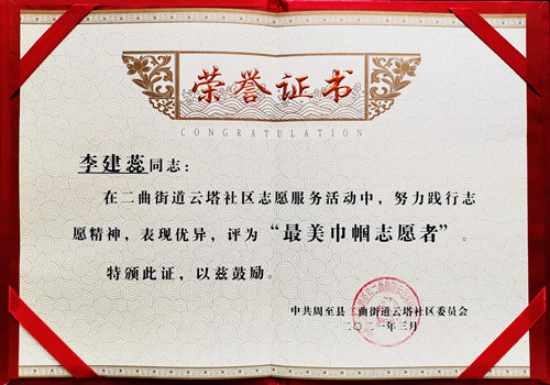 李建蕊被云塔社區(qū)評為“最美巾幗志愿者”