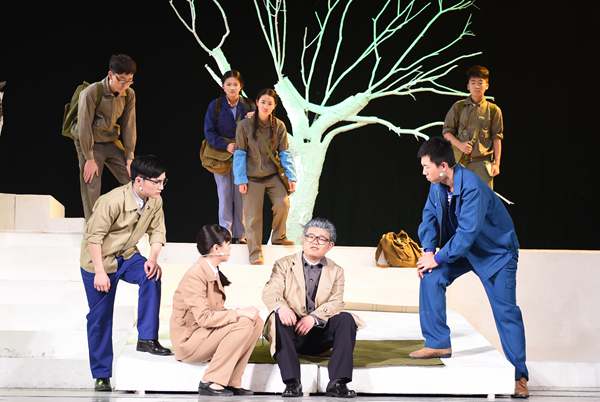 ? ? 場景中的小喇叭廣播再一次開始播報新聞,新聞的播報讓正拿著一堆科研手稿準備給自己老師的雅坤瞬間撲倒在地。是的也讓我們的心跟著揪起來,就算我們已經(jīng)知道這位偉大的地質(zhì)力學之父、共和國第一位地質(zhì)部長、中國科學協(xié)會第一任主席、這面旗幟—李四光先生已經(jīng)離世,但是我們還是為這小喇叭播報李四光先生的隕逝而悲痛。雅坤逐漸在兄弟廣生的悲劇和老師去世的陰影中走了出來,踏著老師的足跡帶著兄弟的夢想依然在科研工作中奮戰(zhàn),繼續(xù)發(fā)展老師的研究成果。到此話劇《大地之光》已經(jīng)結(jié)束,可李四光先生精神魅力猶如他的名字一樣光照四方!