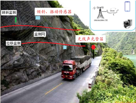 解決方案:在崩塌體上加裝監(jiān)視網(wǎng),通過對(duì)檢測網(wǎng)多個(gè)部位作位移、傾斜、震動(dòng)等高精度實(shí)時(shí)監(jiān)測,達(dá)到對(duì)整個(gè)崩塌體實(shí)時(shí)監(jiān)測預(yù)警的目的,在崩塌體下方公路上設(shè)置無線報(bào)警終端設(shè)備(包括無線信號(hào)接收器、聲光警笛、LED警示屏、太陽能供電系統(tǒng)),當(dāng)智能檢測終端檢測到變形超過設(shè)定預(yù)警閾值時(shí)即時(shí)啟動(dòng)報(bào)警程序,以避免人員傷亡和減小財(cái)產(chǎn)損失。