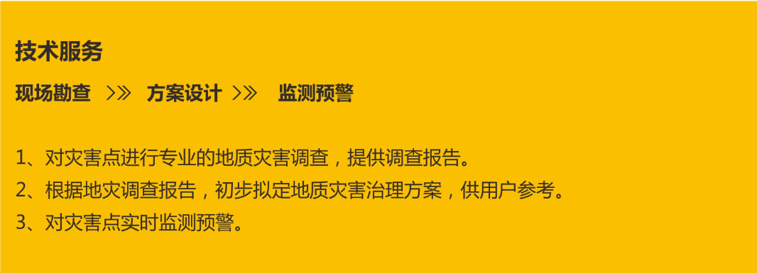 地災(zāi)服務(wù)中心既有專利的支撐,又有技術(shù)和科研能力,根據(jù)用戶需求,對(duì)災(zāi)害點(diǎn)進(jìn)行專業(yè)的地質(zhì)災(zāi)害調(diào)查,根據(jù)調(diào)查報(bào)告,初步擬定地質(zhì)災(zāi)害治理方案,結(jié)合方案安裝設(shè)備,進(jìn)行實(shí)時(shí)監(jiān)測預(yù)警。同時(shí)對(duì)用戶提供現(xiàn)場培訓(xùn),及電話指導(dǎo)故障維修或者現(xiàn)場排除故障等一體化服務(wù)。